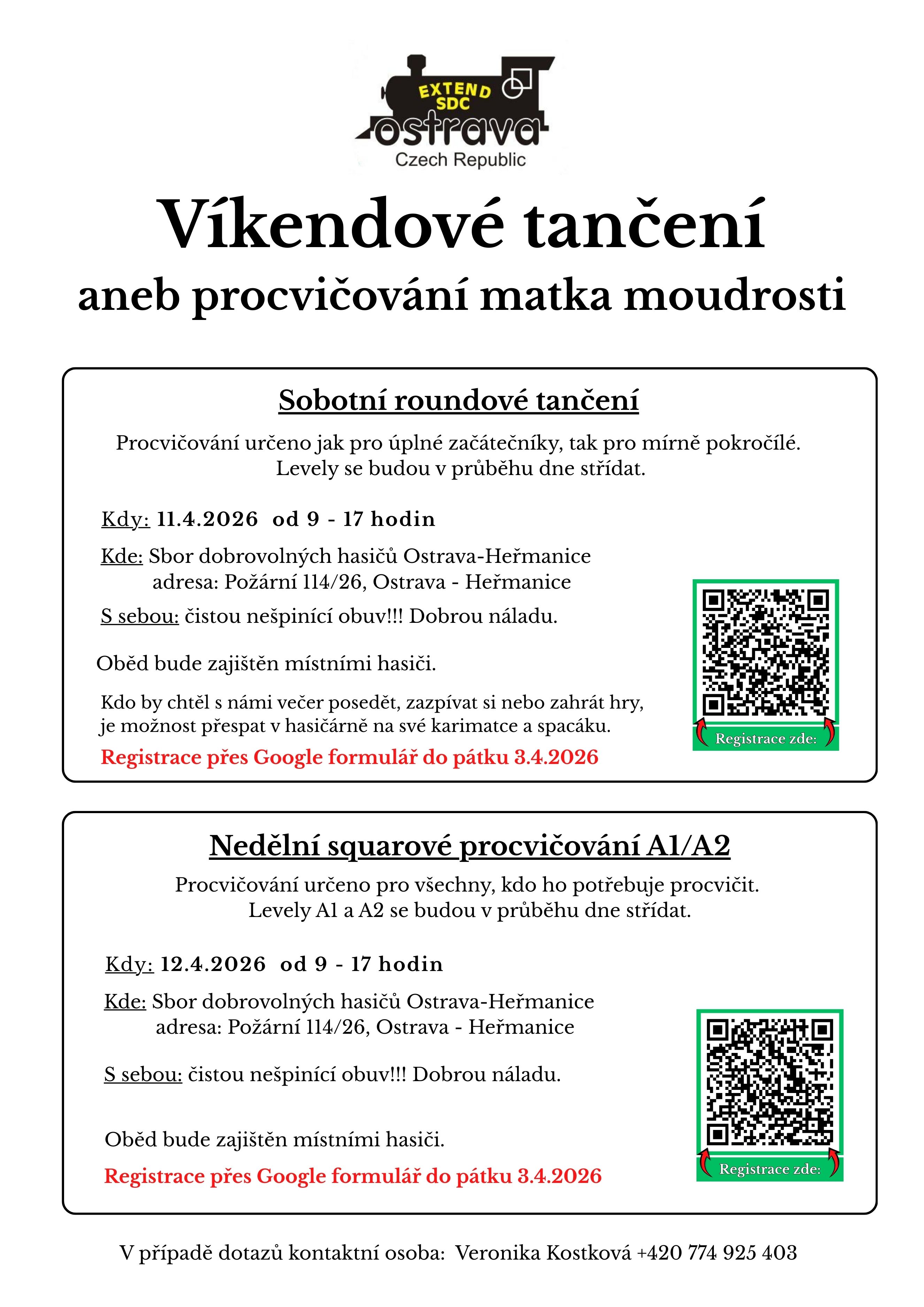 | 12. | 4. | Sonntag A1/A2 Workshop, Extend SDC, Hasičská zbrojnice, Požární 114/26, Ostrava-Heřmanice; A1, A2; 9 bis 17 Uhr, saubere unfärbende Schuhe nötig, Anmeldung nötig bis 3. April, flyer (in Tschechisch), +420 774 925 403 | |||||